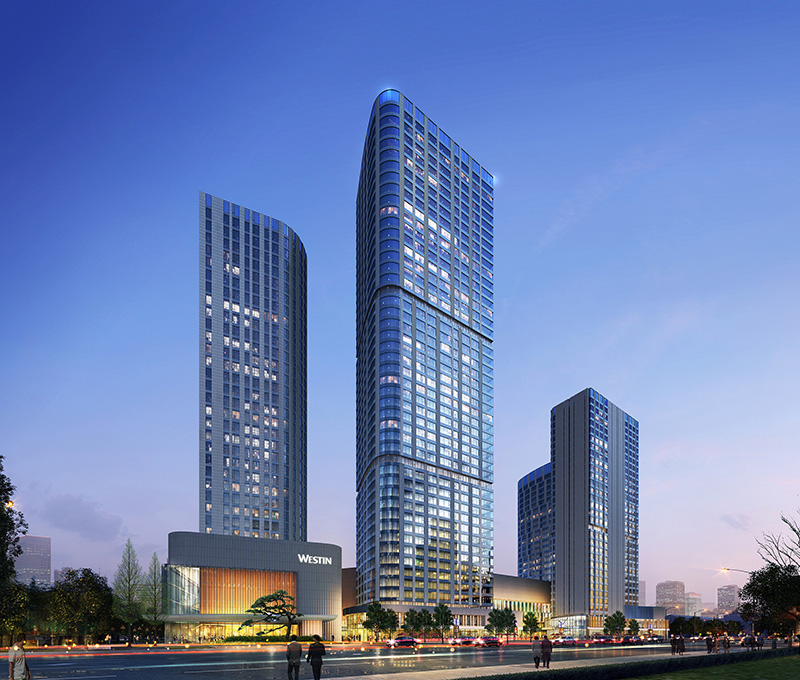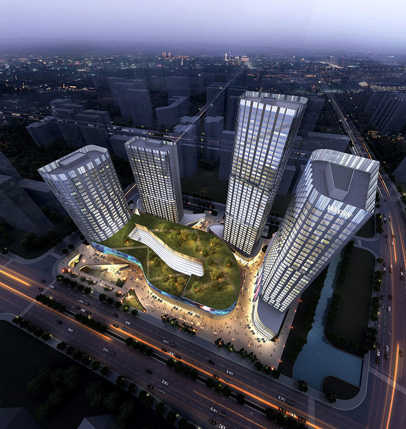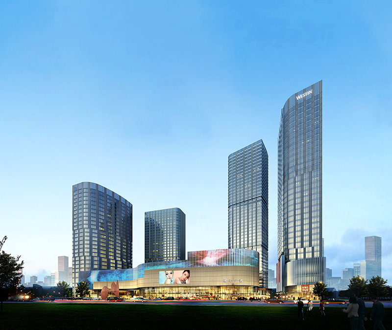 工程規模:總建筑面積284477.55m2,其中地下室三層,建筑面積91125.3m2;地上五幢樓:1#樓24層,高度94m,建筑面積30477.12m2;2#樓31層,高度98m,建筑面積29786.96m2;3#樓45層,高度143.4m,建筑面積45312.95m2;4#樓34層,高度132.75m,建筑面積46405.75m2;5#樓5層,高度33.6m,建筑面積41369.47m2。主體結構為鋼結構。建成后將成為下沙經濟開發區的標志性建筑。